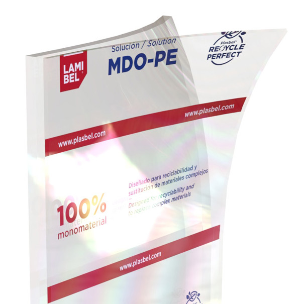 Lamibel® MDO-PE is a film where the outer layer is MDO-PE (machine direction oriented polyethylene) and the inner film is PE. The mono-material structure enables the entire film to be recycled through the PE stream while delivering high barrier, clarity and process performance.